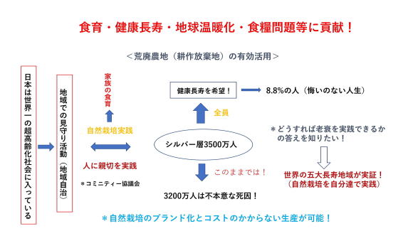 *全国各地の耕作放棄地を有効活用し、食育・健康長寿のため自然栽培農産物を自分達で作る会 *全国各地の市町村にお住いの市民 *正会員(実践会員) *賛助会員(購入会員) *会費は共に1日10円年間4000円